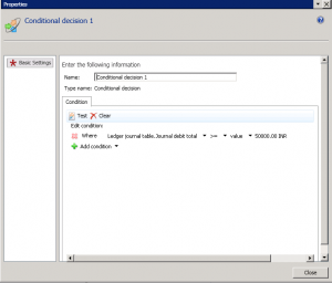 After that, double click on conditional decision and the given condition there. In the given case we are given a condition that if the journal total debit amount is greater than 50000 it requires the approval.