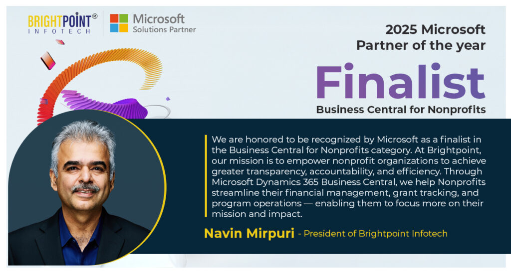 “We are truly honored to be recognized by Microsoft as a finalist in the Business Central for Nonprofits category,” said Navin Mirpuri, President of Brightpoint Infotech. “Our mission is to enable nonprofit organizations to focus on what matters most—making an impact—by equipping them with cutting-edge technology that streamlines financial management, grants administration, and program oversight.”