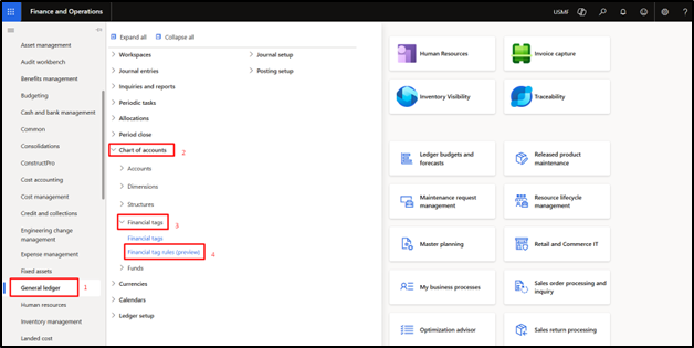 Once this feature is enabled, Users can find the financial tag rules(preview) in General ledger > Chart of accounts > Financial tags > Financial tag rules(preview).