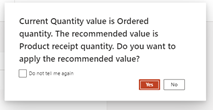 1. You may checkmark “Do not tell me again” and Click No if you wish to default to “Ordered Quantity” and do not want the dialogue box again.