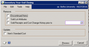 - Go to Microsoft Dynamics GP –> Tools –> Routines –> Inventory – Year End Close. The following window will appear. You can select the option to remove any discontinued items. All Items marked as discontinued in the item cards will be removed. You can also update the Item’s standard cost at this stage.