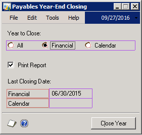 - Go to Microsoft Dynamics GP –> Tools –> Routines –> Purchasing –> Year End Close. The following window will appear
