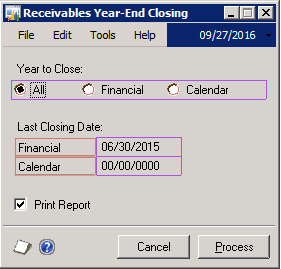 - Go to Microsoft Dynamics GP –> Tools –> Routines –> Sales –> Year End Close. The following window will appear