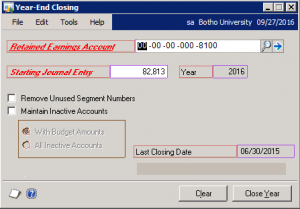 - Go to Microsoft Dynamics GP –> Tools –> Routines –> Financial –> Year End Close. The following window will appear
