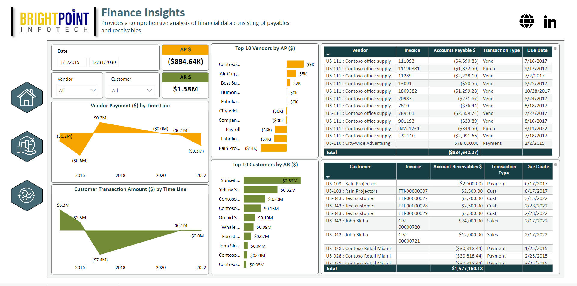 The Finance Insights dashboard has been developed with the data from Dynamics365 F&O. Similar reports like these can be developed from D365 BC or any other application having similar data