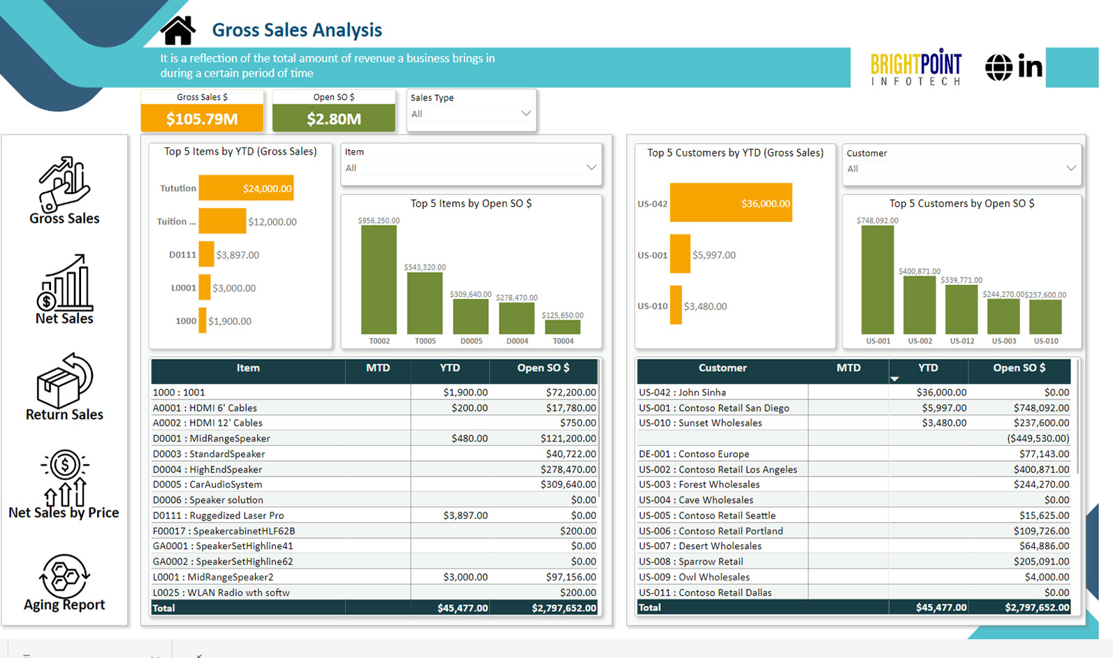 Gross Sales report provides relevant information and insights for the gross sales analysis and provides insights into the overall revenue generated by your sales efforts. and similarly for Net sales to understand the true impact of your sales efforts on the bottom line, a report for Net sales by Sales price to get insights on sales revenue based on different sales price points or pricing tiers, a Return sales report to analyze sales returns or product refunds and implement strategies to reduce return rates and improve customer satisfaction. An aging report to see the customer wise and item wise aging to track the age of outstanding sales invoices or accounts receivable. With Sales Insights Power BI dashboard, you can gain a comprehensive understanding of your sales performance, identify areas for improvement, and drive revenue optimization.